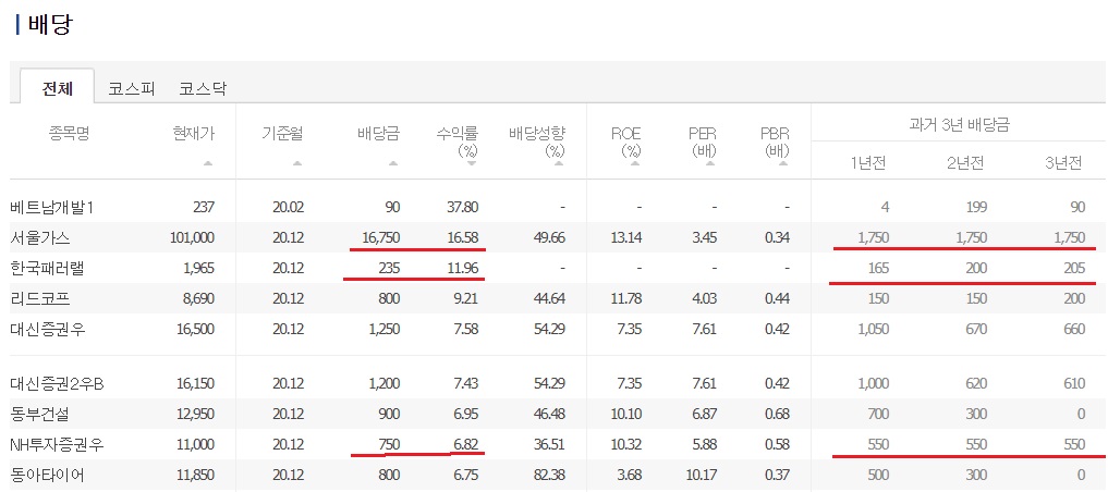 네이버 증권에서 [국내증시], [배당]을 클릭하면 아래와 같이 주식 배당 성향이 나타납니다.