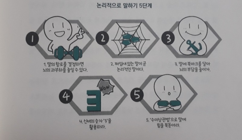 논리적으로 말하기 위해서는 ‘주제와 중심내용 정하기, 주제와 중심내용에 대해 말하고 싶은 것을 잘게 쪼개서 분류하기, 주제와 중심내용을 분류한 뒤 요약하기, 분류한 것 중 딱 3개만 선택하여 전달하기, 수미상관 형식으로 한 문장으로 정리하기’를 연습하면 됩니다.