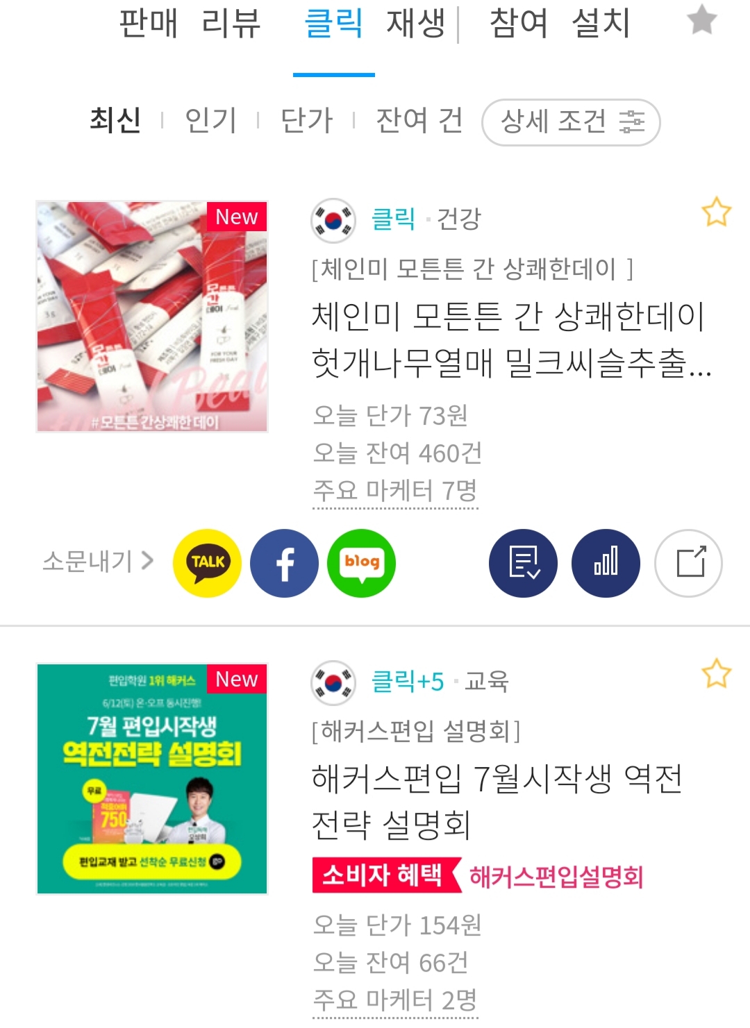 판매, 리뷰, 클릭, 재생, 참여, 설치 등 카테고리에서 상품들을 살펴보고 고를 수도 있고 검색해서 고를 수도 있습니다.