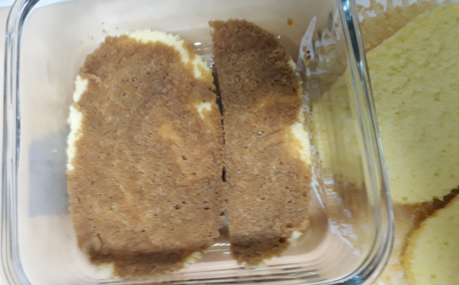 6. 용기에 카스테라를 담고 커피를 적셔줍니다.