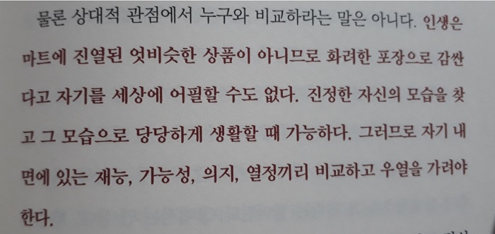 ‘행복에는 여러 모양이 있다. 다른 사람이 보기에 아무 의미가 없어 보이는 것도 당사자에게는 남다른 의미일 수 있다. 그것을 타인 이 왈가왈부해서는 안 된다. 행복의 기준은 자신이 정하는 것이다. 그 지점에서 만족과 기쁨이 생성되고 자기 가치관을 반영하여 삶의 의미를 더하는 기준점을 마련한다.’