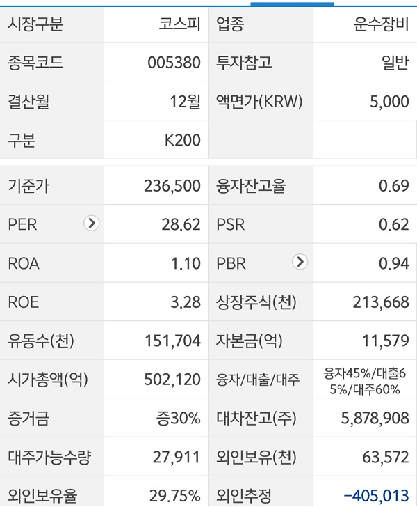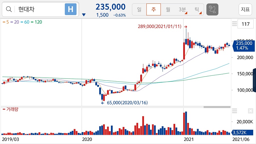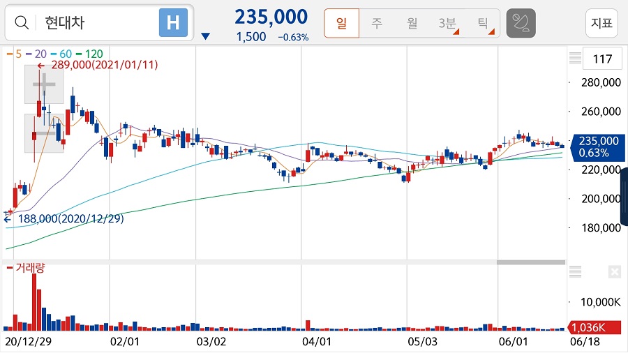 현대차는 6월 18일, 23500원으로 장을 마감했습니다.