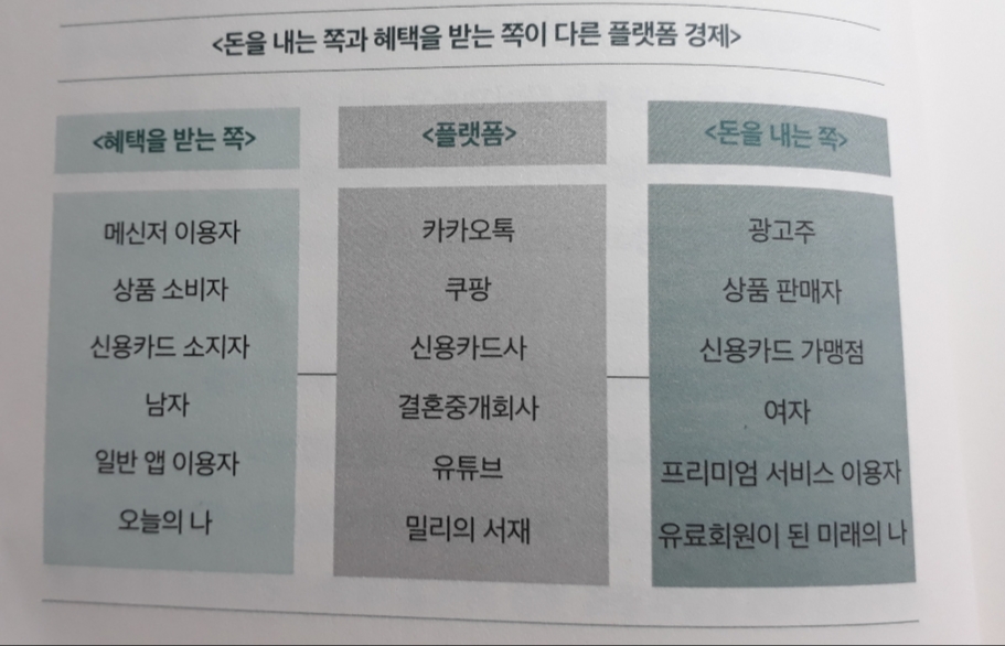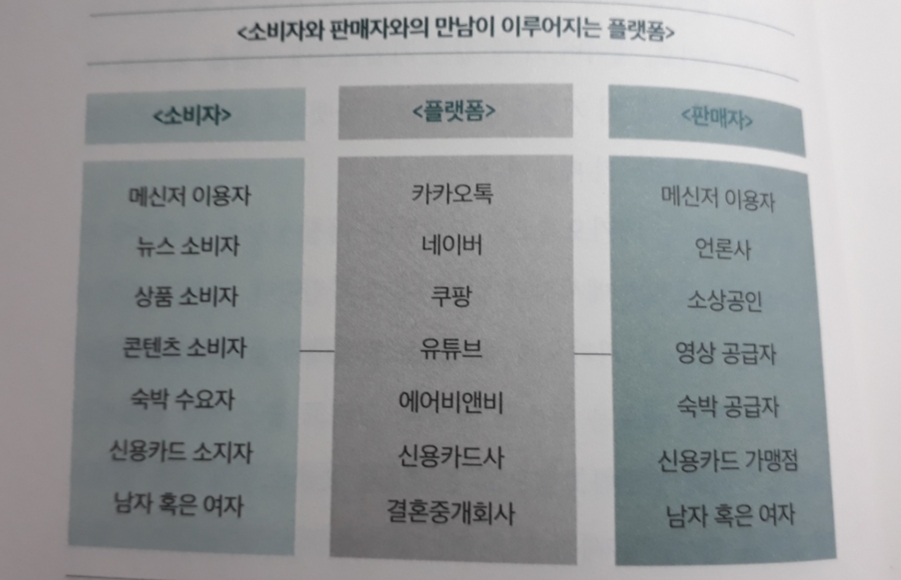 ‘소비자와 판매자라는 전혀 다른 두 경제주체를 연결하는 기능 때문에 플랫폼을 양면시장(two-sided market)이라 일컫는다.(중략) 양면시장이 성립하는 이유는 두 경제주체가 서로를 필요로 하기 때문이다.’