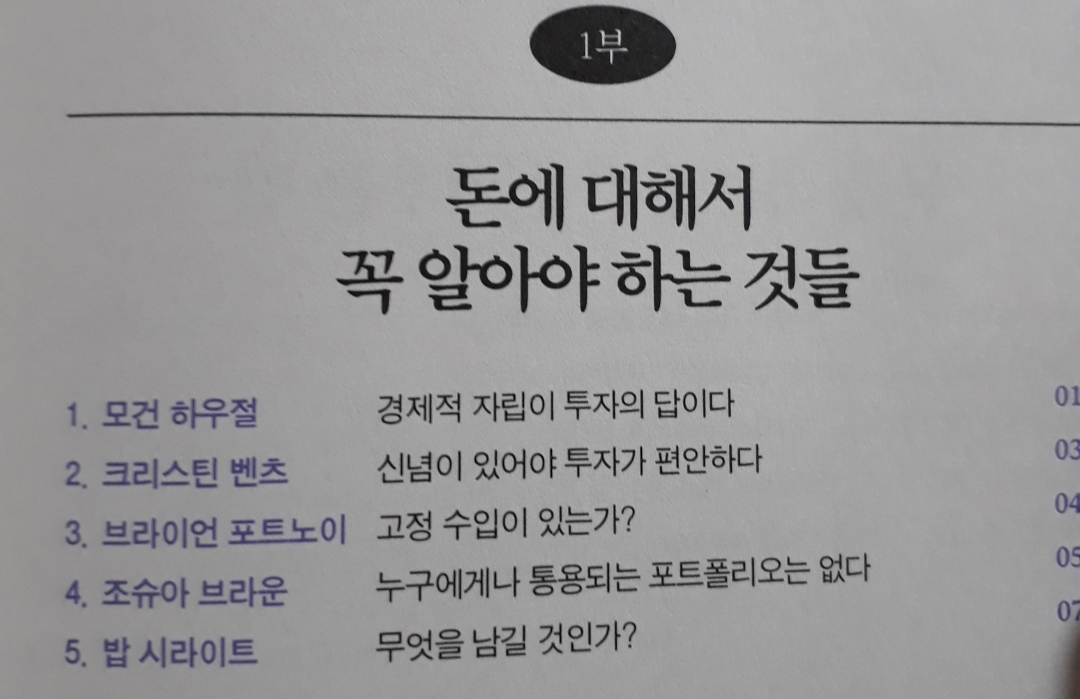 미국 재무 설계사, 공인 재무 상담사, 재무 컨설팅 회사 CEO 등 25명 투자 전문가들의 투자 포트폴리오, 부에 대한 생각을 읽을 수 있습니다. 다른 사람들의 재정적 성공과 안정을 위해 일하는 자산관리 전문가들이 정작 본인의 자산은 어떻게 투자하고 관리하는지 궁금해서 읽게 되었습니다.