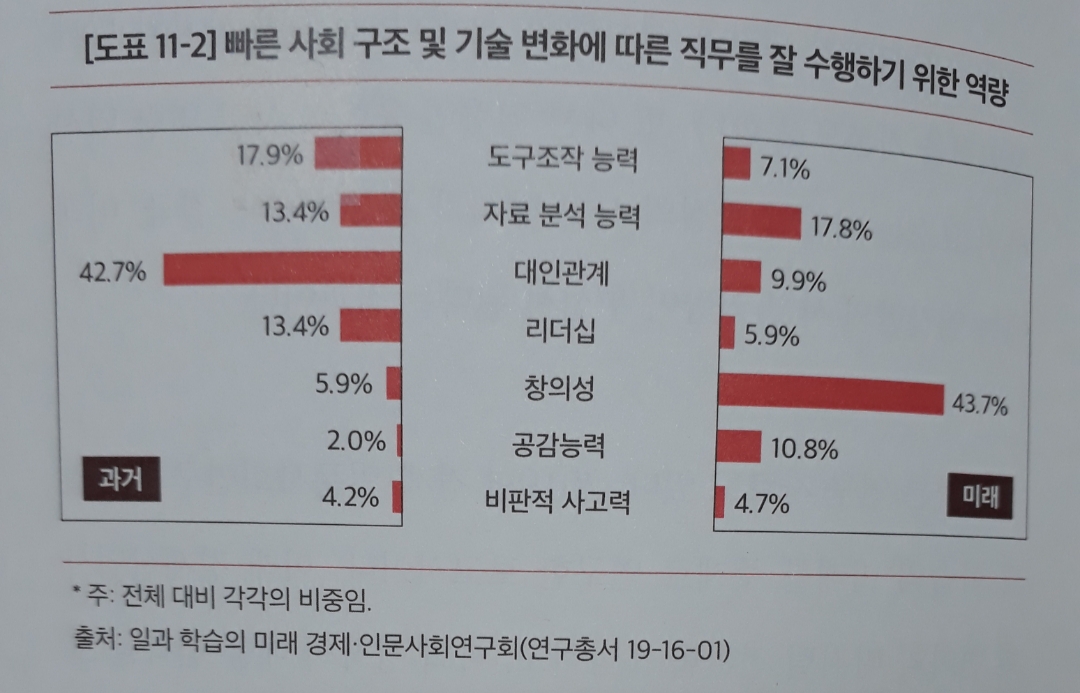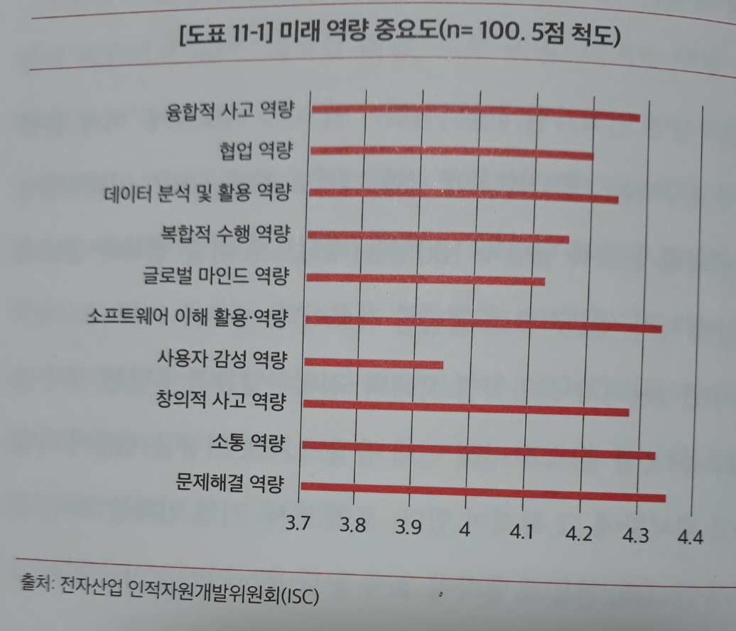 미래 인재의 역량 중요도 표도 기억해 봅니다. ‘문제해결 역량, 소통 역량, 창의적 사고 역량, 소프트웨어 이해 활용 역량, 데이터 분석 및 활용 역량, 융합적 사고 역량’이 많이 필요하군요.