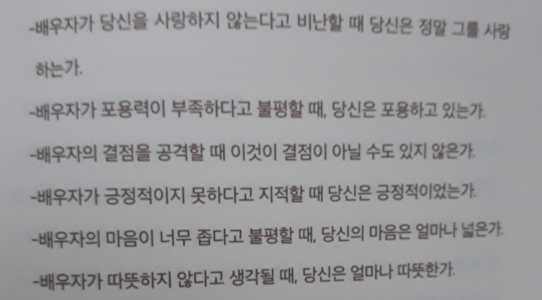 “남편(아내)이 바람을 피지 않으면, 돈을 잘 벌어 오면, 술을 끊으면... 같이 살겠다고 하는데 그건 말이 안 된다. 바람이나 돈, 술과 상관없이 같이 살지 말지를 결정해야 한다. 단점에도 불구하고 장점이 많다면 같이 살고 단점 때문에 도저히 못살겠으면 ‘안녕히 계세요’ 하고 헤어지면 된다.