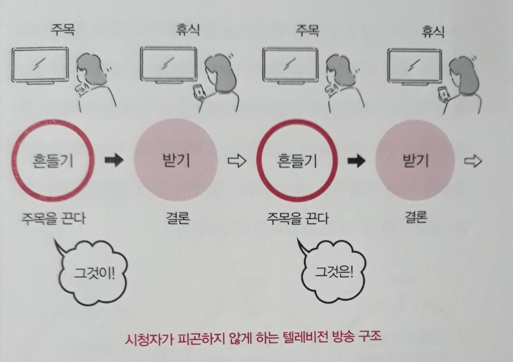 ‘처음 1분 안에 ‘지금부터 시작되는 이야기에는 재미있고 유익한 정보가 담겨있습니다’라는 것을 확실히 보여주어야 한다. 시청자(이야기를 듣는 사람)가 이 방송을 봄으로써 얻게 될 이익을 명확히 제시해야 한다.’