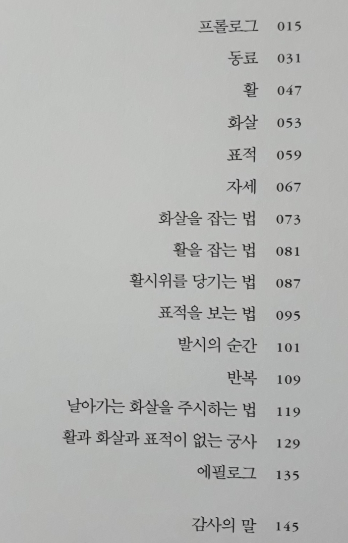 “당신은 실력과 기품과 좋은 자세를 모두 갖췄습니다.” 진이 말했다. “활쏘기 기술에 능통하고 활을 다룰 줄도 알지만 정신을 다스리는 법은 익히지 못했군요. 모든 상황이 순조로울 때는 잘 쏘지만 곤란한 상황에서는 표적을 맞히지 못합니다. 궁사가 언제나 전장을 택할 수는 없습니다. (중략) 화살을 정확하게 잘 쏘는 것과 영혼의 평정을 유지하고 쏘는 것은 매우 다르다는 점을 기억하십시오.”