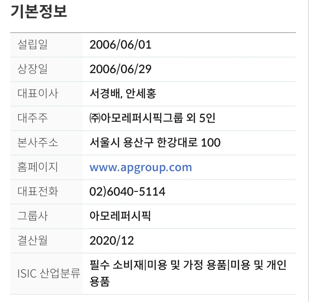 아모레 퍼시픽(090430)은 화장품 제조 및 판매회사입니다. 대표적인 상품으로 설화수와 이니스프리가 있습니다. 화장품 사업을 목적으로 아모레퍼시픽그룹을 인적분할하여 설립했습니다.