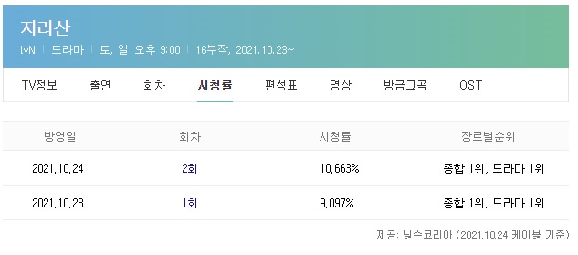 지리산 시청률 2회는 10.663%로 역시 동시간대 종합 1위, 드라마 1위였습니다.