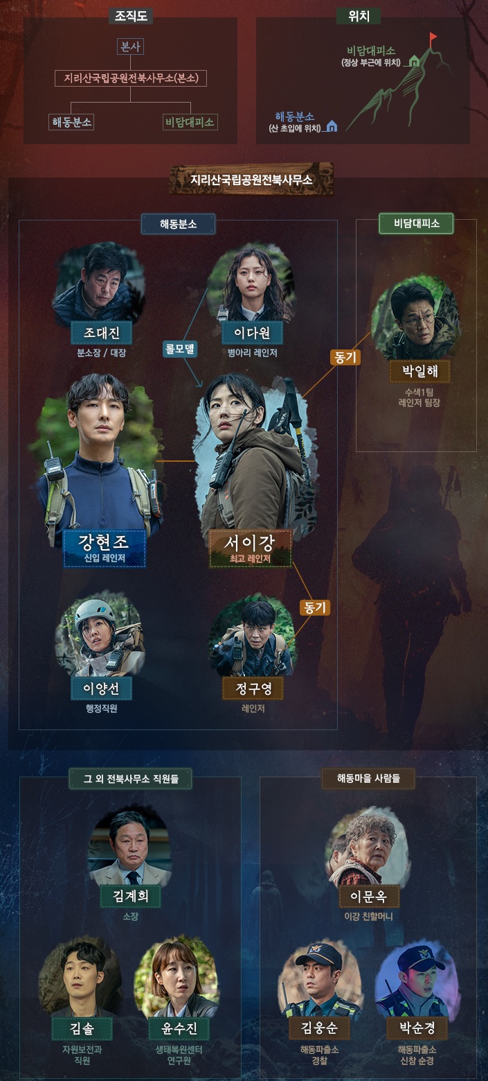 킹덤이나 사인을 통해 사람들이 죽어나가는 내용을 쓴 김은희 작가는 지리산 드라마에서 레인저들이 사람을 살리는 이야기를 쓰고 싶었다고 합니다.