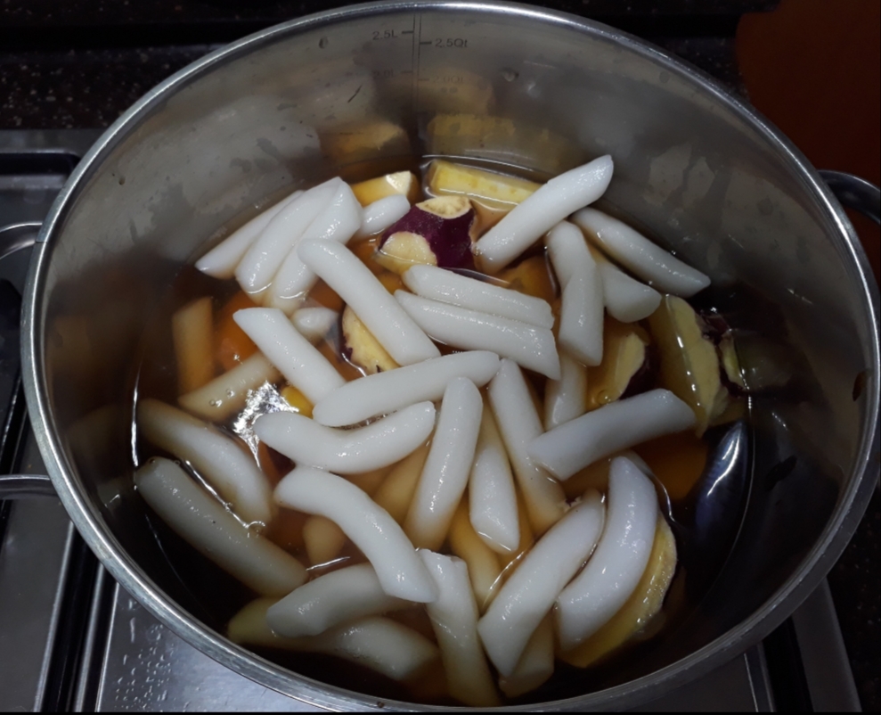 세 번째 조리는 물 500ml에 고구마와 떡볶이 떡을 넣고 진간장 두 스푼을 넣어 끓입니다.