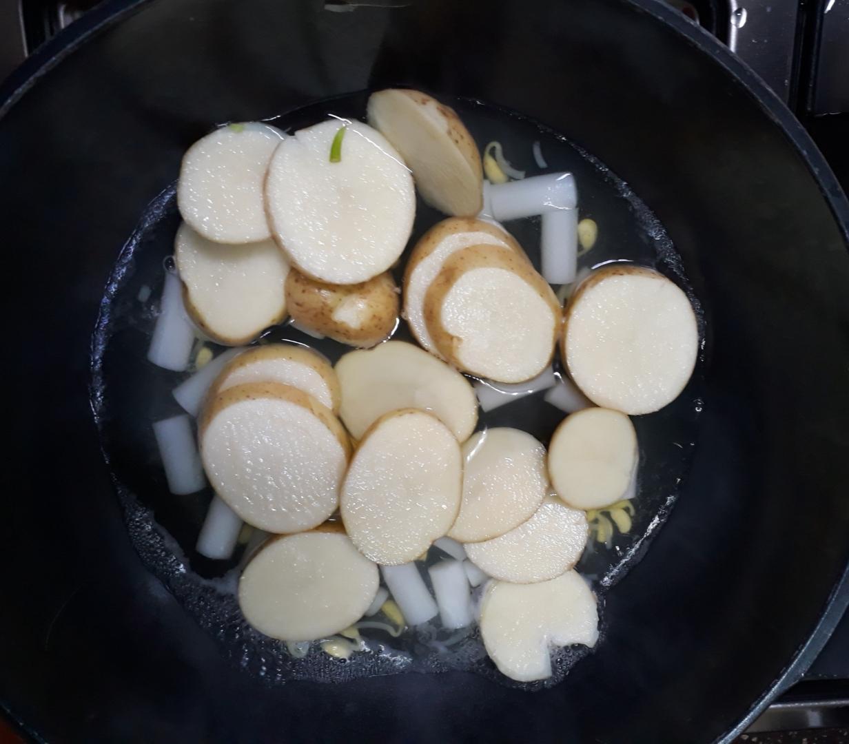 콩나물을 삶아 건진 물에 떡볶이 떡과 감자를 넣고 진간장 두 스푼을 넣어 끓입니다.
