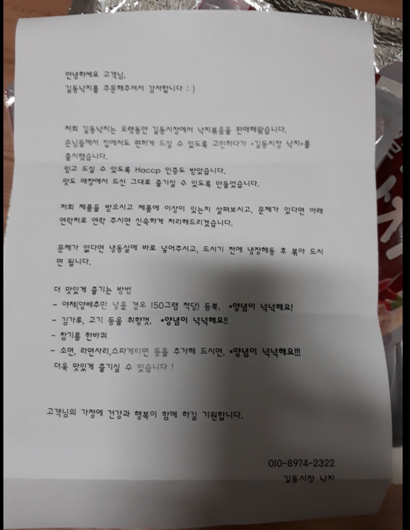 다만 저희 부모님은 연로하셔서 입에서는 자꾸 당기는데 배아플까봐 자제하셨다고 합니다. 덕분에 남동생 가족이 잘 먹었다고 인사하더군요~ 올케는 너무 맛있어서 나중에 친구랑 직접 길동시장 낙지마당에 방문해서 또 먹었다고 해요.