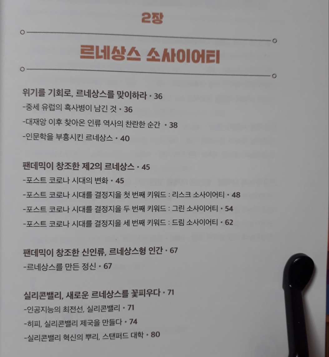저자는 포스트 코로나 시대에 필요한 핵심 역량을 ‘인문적 소양’이라고 말합니다. 르네상스부터 1차 ~ 4차 산업혁명을 아우르는 역사적 사건들이 흥미롭게 소개됩니다. 페스트로 초토화된 유럽에서 르네상스형 인간의 등장으로 문예부흥을 이끌었듯 코로나19 팬데믹 이후 21세기 르네상스형 인간의 등장이 절실히 필요하다는 거죠.