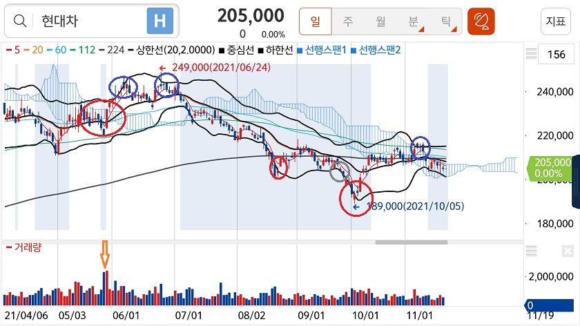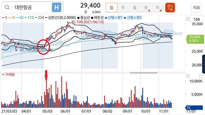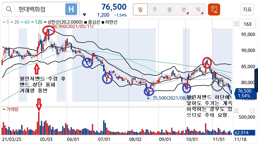 볼린저밴드만 보고 매매하는 것은 아주 위험합니다. 일목균형표의 구름대와 224일 이평선(1년 장기 이평선), 거래량 등등을 함께 봐야합니다.