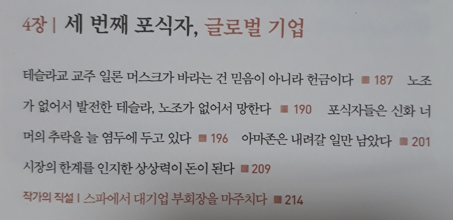 테슬라 외에 아마존과 쿠팡 등에 대한 이야기도 흥미로웠습니다. 배송 사업이 노동 집약적이라는 한계를 갖고 있다는 것입니다. 저자는 ‘시장의 한계를 인지한 상상력이 돈이 된다’고 합니다. 어떤 상상력이 현실화 될지 기대됩니다.