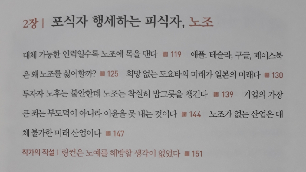 ‘대체가능한 인력일수록 노조에 목을 맨다’는 말이 또 뼈를 때리네요. 저자는 노조에 대해 신랄한 비판을 합니다. 최소한의 노동법과 생존권을 지키려는 노조가 아니라 밥그릇 챙기기에 바쁜 강성 노조, 귀족 노조에 대한 일갈이지요.