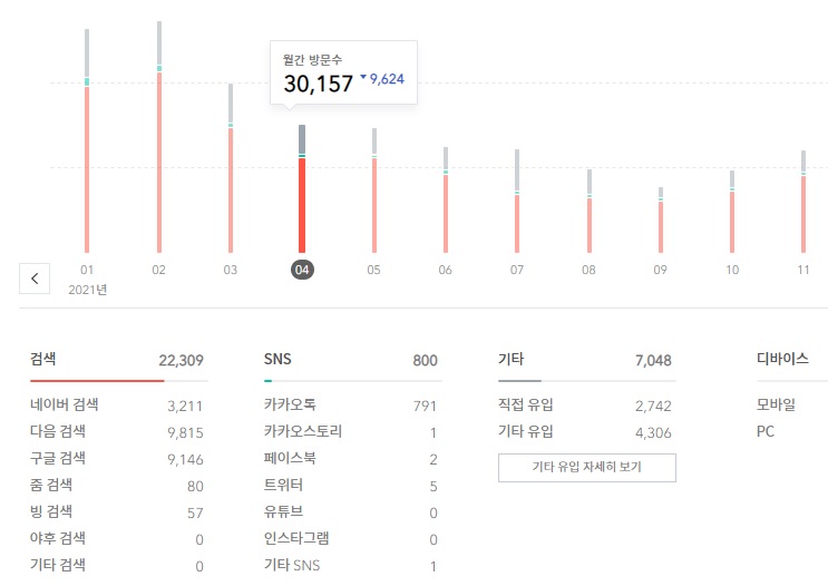 2021년 3월과 비교해서 2021년 11월은 Daum 검색은 줄었는데 구글 검색은 늘었습니다. 해당 포스팅 제목은 롱테일 키워드였고 구글에서 신뢰 받는 문서가 되었습니다.