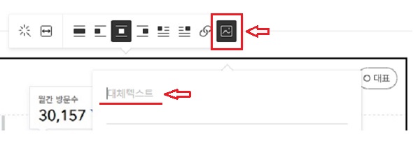 티스토리 에디터에서 쉽게 alt 기능을 사용할 수 있습니다. 사진을 삽입 후 뜨는 메뉴에서 가장 우측 메뉴입니다. 대체텍스트에 그림에 대해 설명하면 됩니다.