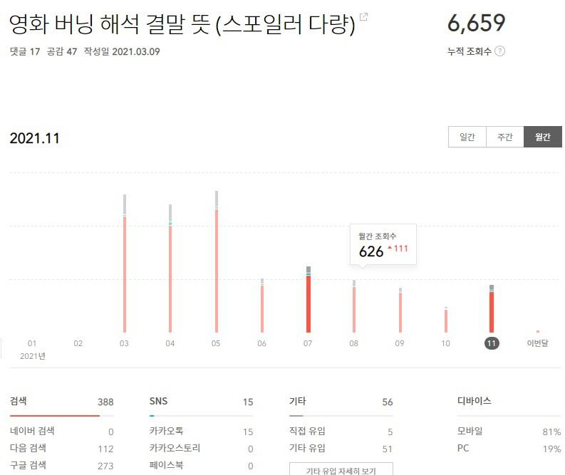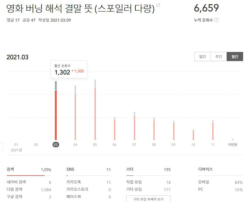 포스팅 처음에는 Daum 검색 유입이 압도적입니다. '영화 버닝 해석 결말 뜻'은 순수한 저의 창작물로 정성껏 길게 작성했다는 특징이 있습니다. 구글 애널리틱스 조회 결과 해당 포스팅의 체류시간이 길었네요.