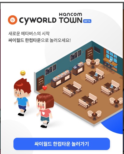 12월 17일(어제) 베타서비스를 오픈한 미팅 공간 메타버스입니다. 한글과컴퓨터(한컴)와 싸이월드제트(싸이월드 운영사)는 합작법인인 '싸이월드-한컴타운'을 설립해서 사업을 운영합니다.