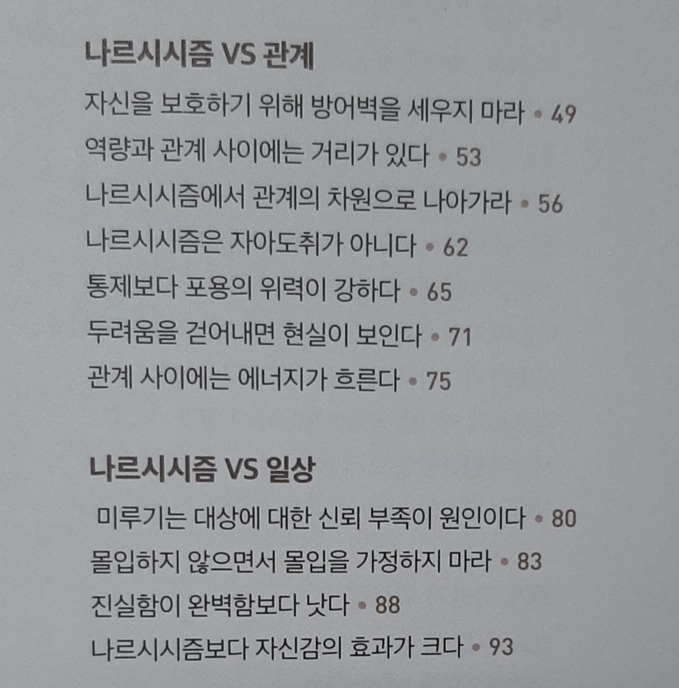 나르시시즘이 인생을 디자인한다, 건강한 나르시시즘에서 배려가 나온다, 지나친 도덕적 나르시시즘을 경계하라, 자신을 보호하기 위해 방어벽을 세우지 마라, 나르시시즘은 자아도취가 아니다, 통제보다 포용의 위력이 강하다, 관계 사이에는 에너지가 흐른다, 진실함이 완벽함보다 낫다.