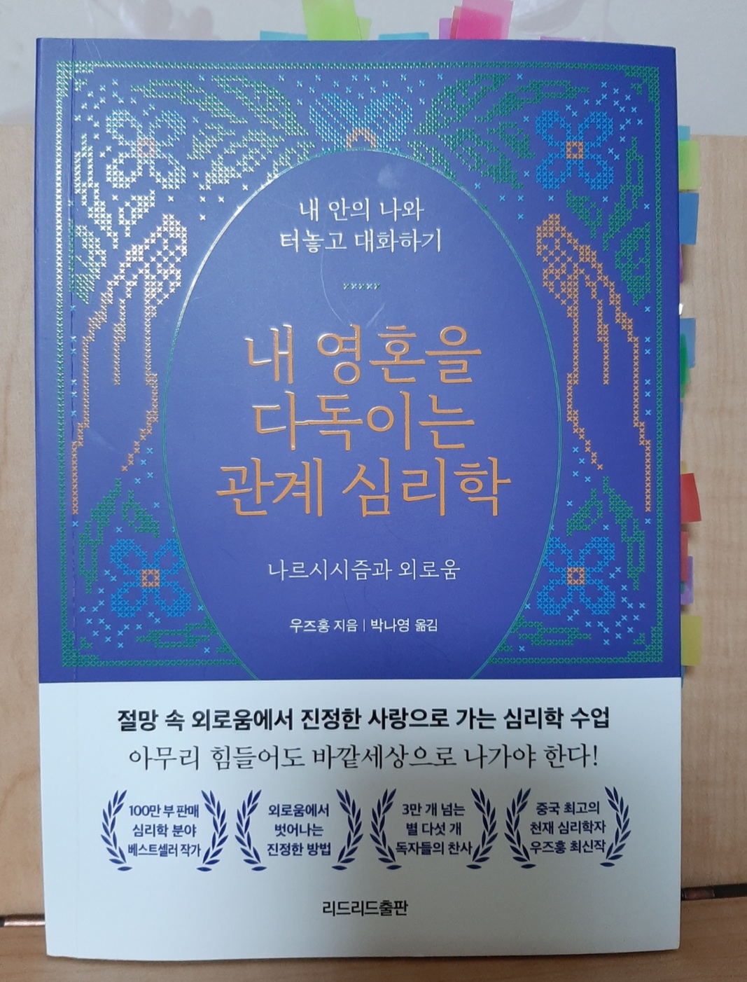 『내 영혼을 다독이는 관계 심리학(리드리드 출판)』은 관념적인 내용이 많은 책입니다. 처음 읽을 때는 내용이 머리에서 겉도는 느낌인데 포스티잇 플래그 붙인 곳 위주로 2독을 마치고 나자 마음까지 울리는 내용이 많았습니다. 저는 심리학, 특히 나르시시즘에 대해 관심이 많다보니 무척 흥미롭게 읽었습니다. 관계 심리학을 통해 인간관계 개선에 관심 있는 분께 일독을 권합니다.