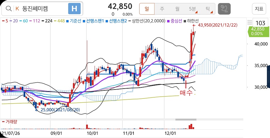 지난 11월 삼성전자 주가가 큰 폭으로 상승하며 시장에서 반도체 업황 개선에 대한 기대감이 형성되었습니다. 저는 동진쎄미켐 차트를 눈여겨 보게 되었습니다.
