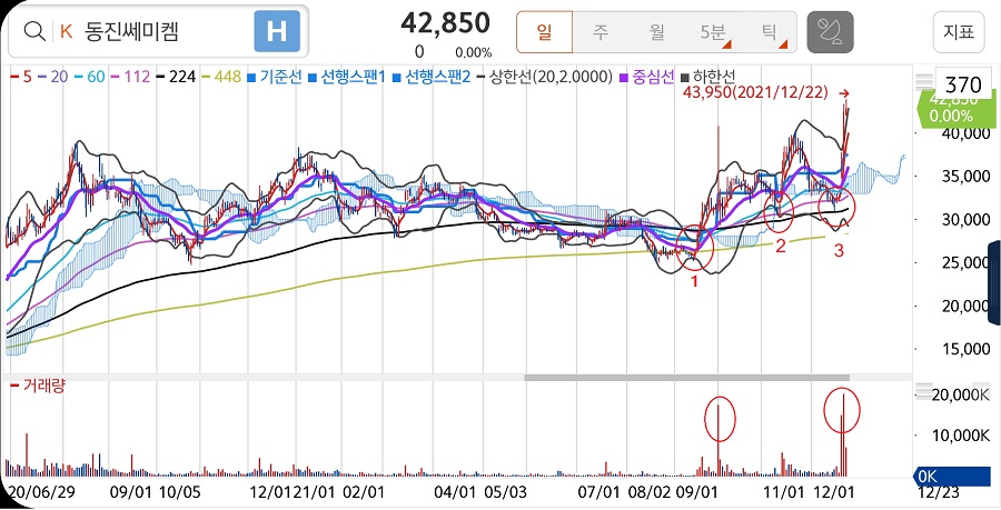 2번 자리에서 112일선(6개월 이평선)과 224일선(1년 이평선) 지지하는 것이 보입니다.