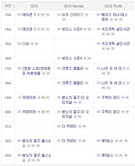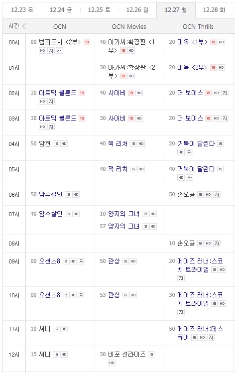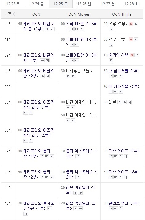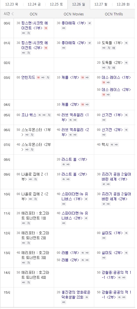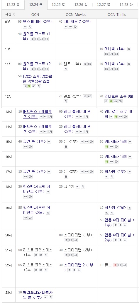 청년 때는 크리마스 절기가 되면 저절로 마음이 들떴는데 이제는 스스로 분위기를 만들어야 되더군요. 절기에 무덤할 수도 있지만 절기를 챙기는 건 평범한 날을 특별하게 만드는 재미가 있습니다. 22일 동지에는 팥죽을 쒀 먹었습니다. 올해 크리스마스에는 팝콘대신 강냉이 잔뜩 덜어 놓고 크리스마스 특선영화를 즐겨야겠습니다. 다음은 24일부터 27일까지 OCN, OCN Movies, OCN Thrills의 영화 편성표(드라마 포함)입니다. 25일의 지상파 특선영화도 정보도 알려드립니다.