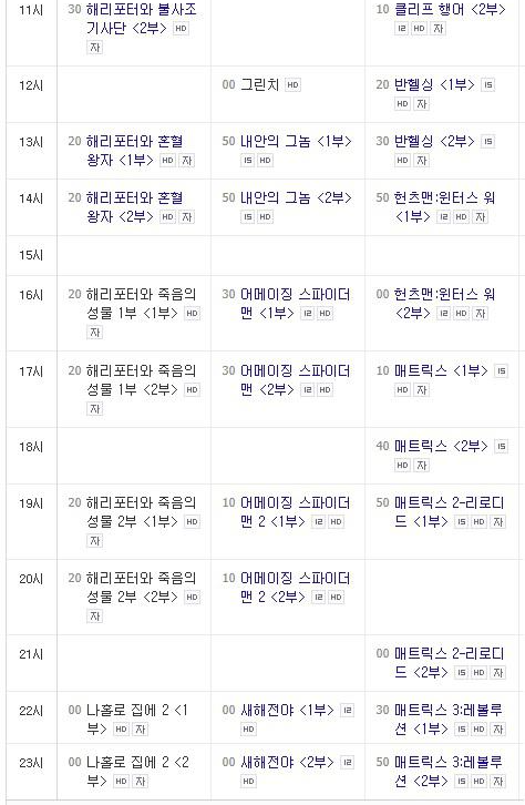 OCN은 완전 해리포터의 날이군요. 해리포터 시리즈 영화추천합니다. 저는 해리포터 시리즈를 전부 읽었고 시리즈 7은 원서를 예약주문해서 읽었습니다. 어린이물이라고 가볍게 보셨다면 오산입니다. 스토리 전반에 삶에 대한 철학이 감동적으로 스며있습니다. 그리스로마 신화에 대한 지식이 있다면 곳곳에서 신화를 차용한 부분을 발견하는 재미가 쏠쏠할 겁니다. '비긴 어게인' 감동적으로 본 영화입니다. 매트릭스1, 2, 클리프 헹어 무척 재미있습니다.