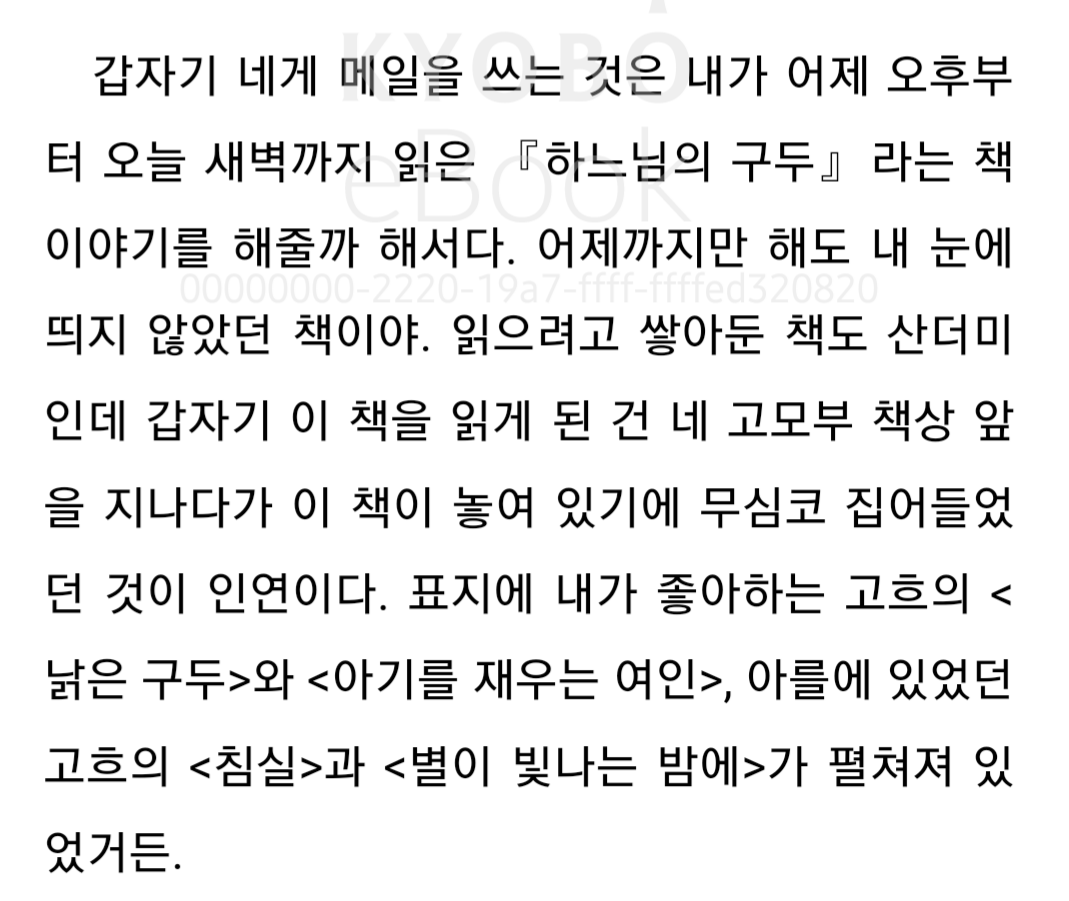 제목 ‘하느님의 구두’ 이야기에는 고흐가 나와서 반가웠습니다. 고흐는 불운하고 고독한 천재 화가였을 뿐만 아니라 사랑이 많은 사람이었다는 거지요. 고흐의 '영혼의 편지'를 다시 읽어보고 싶어졌습니다. ‘돈을 좇지 말고 열정을 따르라’는 메시지도 있는 이야기였습니다.