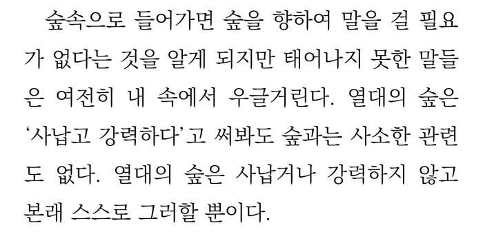 숲속으로 들어가면 숲을 향하여 말을 걸 필요가 없다는 것을 알게 되지만 태어나지 못한 말들은 여전히 내 속에서 우글거린다.'