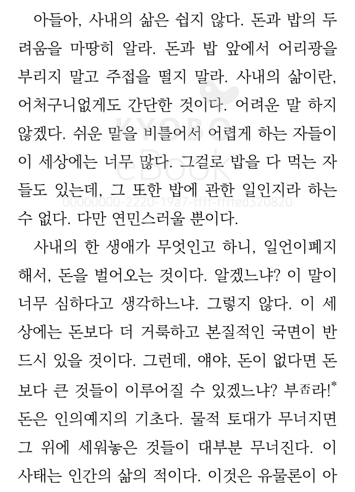 ‘딸아이가 공부를 마치고 취직해서 첫 월급을 받았다. 딸아이는 나에게 핸드폰을 사주었고 용돈이라며 15만 원을 주었다. 그 아이는 나처럼 힘들게, 오직 노동의 대가로서만 밥을 먹고 살아가게 될 것이다. 진부하게, 꾸역꾸역 이어지는 이 삶의 일상성은 얼마나 경건한 것인가. 그 진부한 일상성 속에 자지러지는 행복이나 기쁨이 없다 하더라도, 이 거듭되는 순환과 반복은 얼마나 진지한 것인가.’