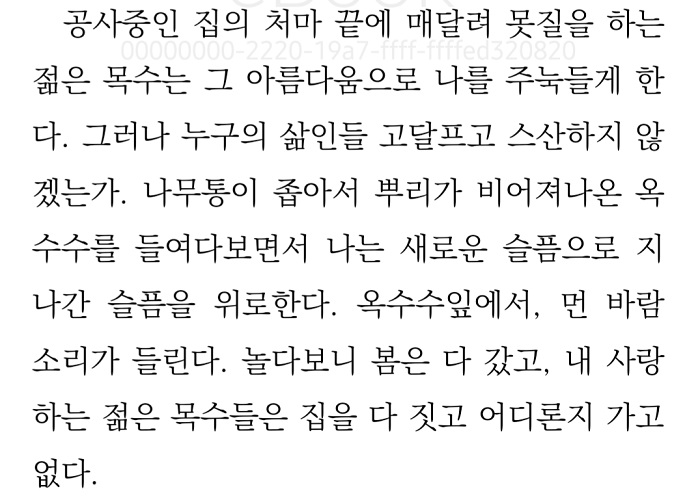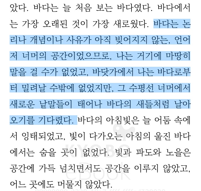 ‘본래 스스로 그러한 것들을 향하여 나는 오랫동안 중언부언하였다. 나는 쓸 수 없는 것들을 쓸 수 있는 것으로 잘못 알고 헛된 것들을 지껄였다. 간절해서 쓴 것들도 모두 시간에 쓸려서 바래고 말하고자 하는 것은 늘 말 밖에 있었다. 지극한 말은, 말의 굴레를 벗어난 곳에서 태어나는 것이리라.’