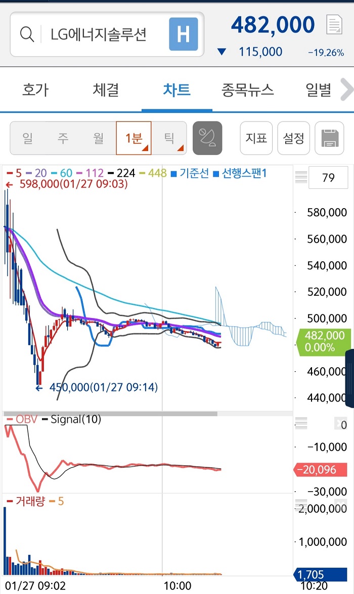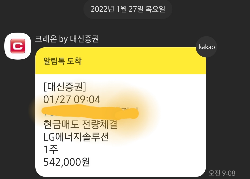 저는 대신증권을 통해 LG엔솔 1주를 배정받았습니다. 욕심부리지 말고 52만원 선에서 매도하겠다고 결정했습니다. 대신증권 앱 크레온의 접속 폭주가 예상돼서 8시 40분에 미리 접속했습니다. 시장 외 호가를 살펴보다가 9시 땡 하면서 주린이라서 시초가인 598,000원도 보지도 않고 599,000에 매도주문을 넣었습니다.