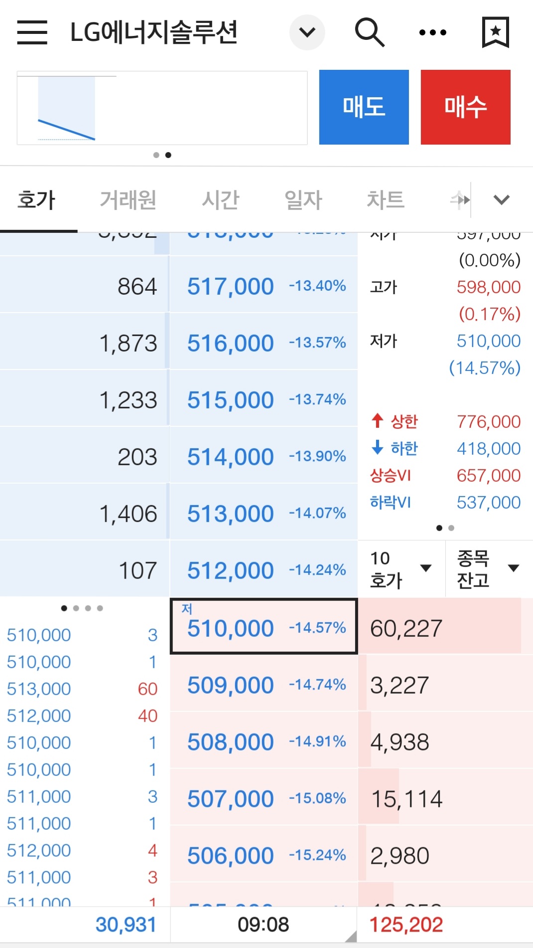 호가창의 숫자가 초고속으로 바뀌는 것을 보면서 나를 포함 우리들의 엄청난 탐욕을 보는 듯했습니다. 매수잔량이 매도잔량보다 현격하게(2배 이상) 많은 게 보입니다.