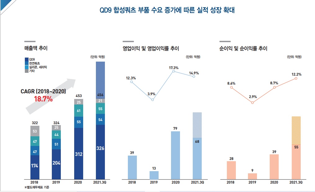 주 사업 부문이 반도체 생산에 필요한 소모품(꾸준한 매출 발생)이라는 점, 소모품 제조에 필요한 합성쿼츠 국산화에 성공했다는 점, 거래처가 삼성전자와 SK하이닉스라는 점 등은 매력적입니다.