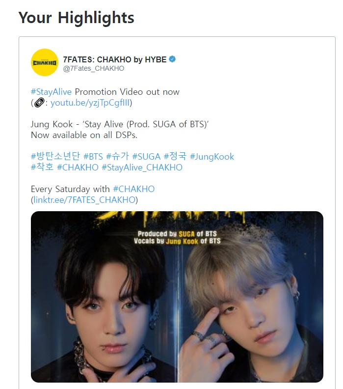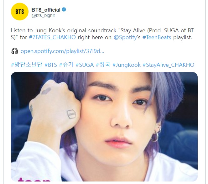 저는 방탄소년단 소식을 트위터 메일로 받아보고 있습니다. 방탄소년단 BTS 슈가(SUGA, 민윤기)가 프로듀싱하고 JK(전정국)가 부른 stay alive가 공개 되었다는 메일을 받았습니다. 슈가가 방탄소년단 멤버가 아닌 개인 작업을 할 때의 예명은 어거스트디(agustd)죠.
