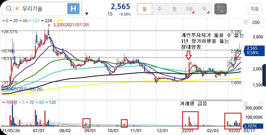작년 9월 10월, 전일 대비 200~300% 거래량 급등하면서 위꼬리가 긴 매집봉이 보입니다. 올해 1월 개인 투자자가 뚫을 수 없는 1년 장기이평선(240일 선 또는 224일 선)을 뚫는 장대양봉이 섰습니다. 3월11일에 강한 저항대인 2,350원을 뚫는 장대 양봉이 보입니다. 그리고 바로 다음 저항대인 2,500원도 뚫었네요.