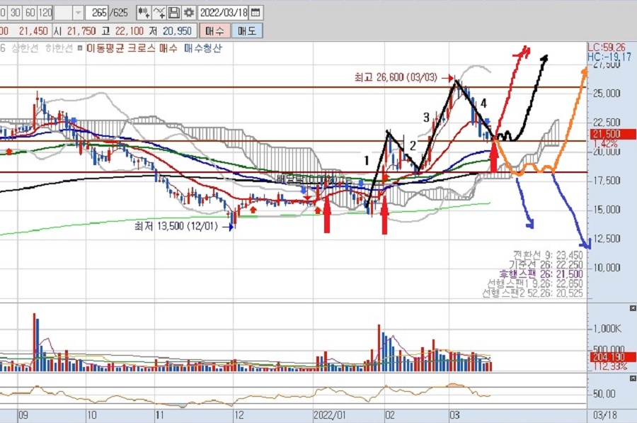 2. 차트 상 주황색처럼 주가가 움직일 경우 18,000원 부근이 지지라인이 됩니다. 고수들은 수급이나 체결 강도 등을 확인하면서 주황색 시나리오에 베팅할 경우 21,500원에서 18,000원 사이에서 분할 매수 하더군요.