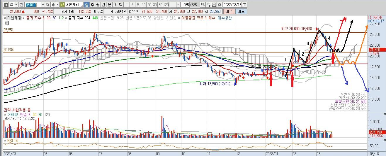 대한제강 일봉 차트상으로는 엘리어트 3파 중 2파가 완성된 것으로 볼 수 있습니다. 대한제강은 엘리어트 1~5번 상승 파동 중 1번 상승, 2번 하락, 3번 상승, 4번 하락 자리로 볼 수 있습니다. 3월 18일 금요일에 4번 하락 눌림목이 되었고, 5번 상승을 준비하는 기술적 반등 자리라고 할 수 있습니다.