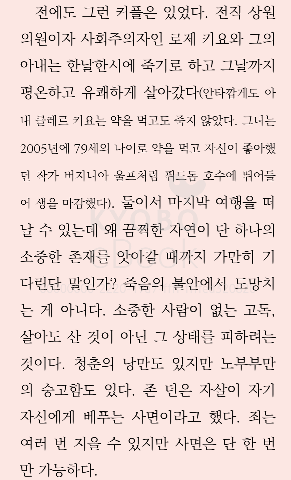이 안식년은 독이 든 선물이다. 오래 사는 만큼 병도 오래 앓는다. (중략) 의학은 장애와 치매를 만들어내는 기계가 되었다. 이미 너덜너덜해진 삶을 20년이나 더 살라니! (중략) 노년은 신체와 정신이 그럭저럭 괜찮다는 조건에서만 참을 만하다.