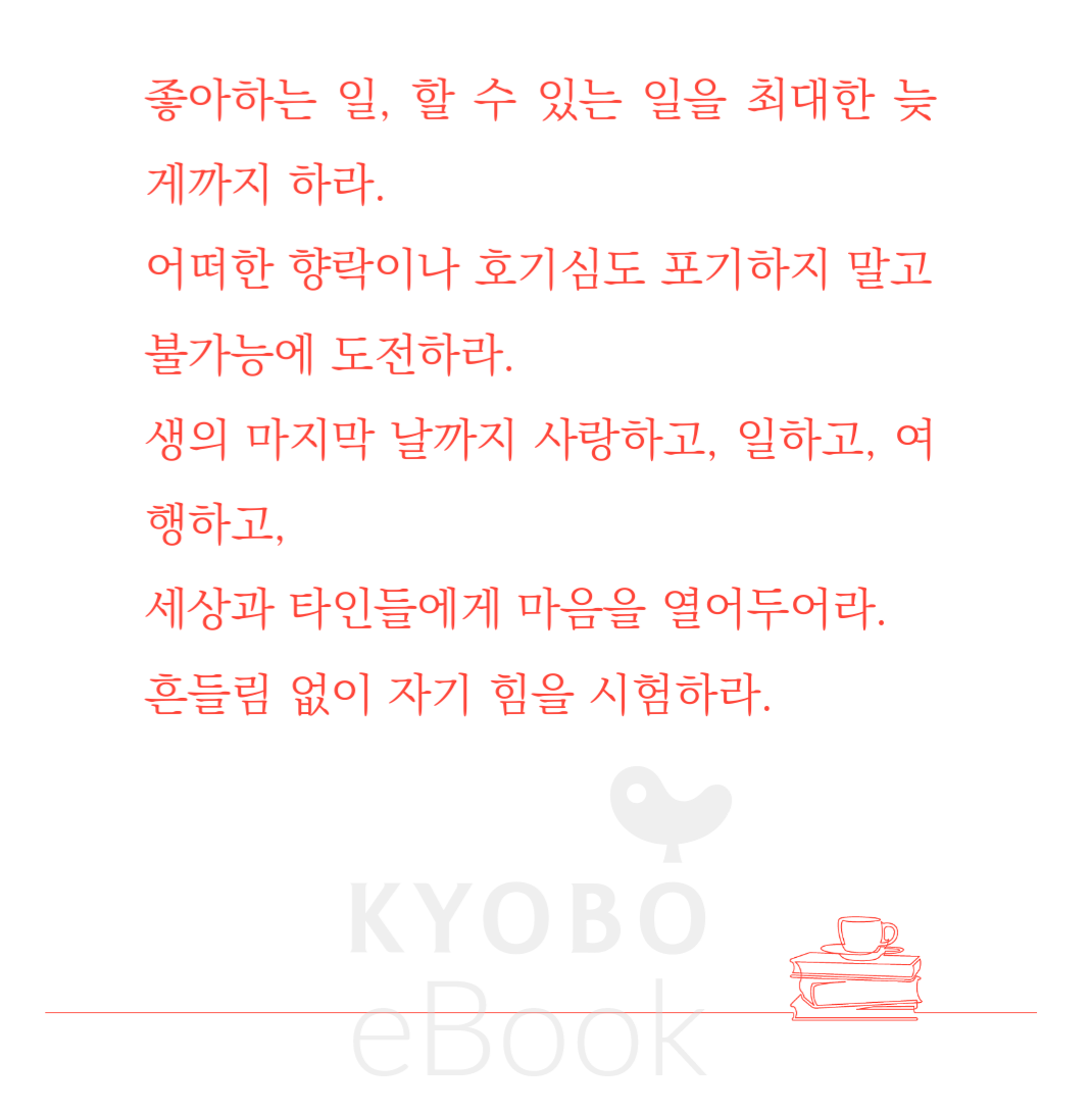 우리에게 생년월일을 지정해주는 것은 행정서류다. 나이는 생물학적 현실에 기댄 사회적 관습이다. 관습은 언제라도 변할 수 있다. 물론, 결국 우리는 쓰러질 것이다. 중요한 것은, 끝까지 패배를 내면화하지 않는 것이다.’