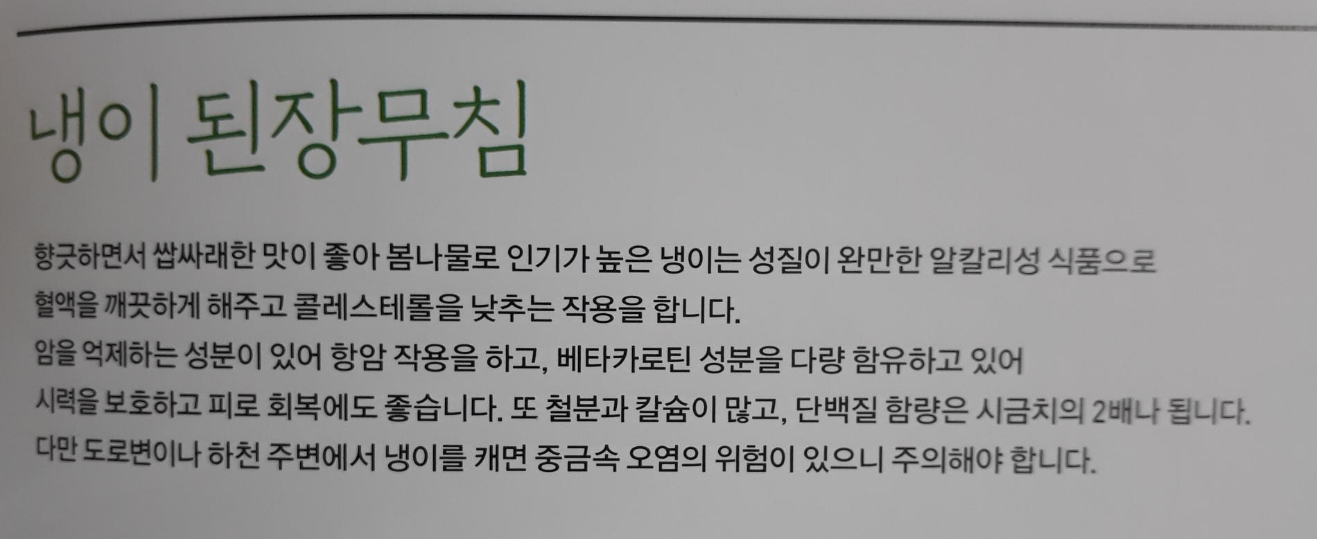 고급 종이 질에 선명한 음식 사진이 당장 만들어 보고 싶은 마음이 들게 한다. 잣소스 더덕 샐러드, 냉이 된장무침, 애호박 생우젓 볶음, 감자 조림, 새송이버섯 조림을 해 보았다.