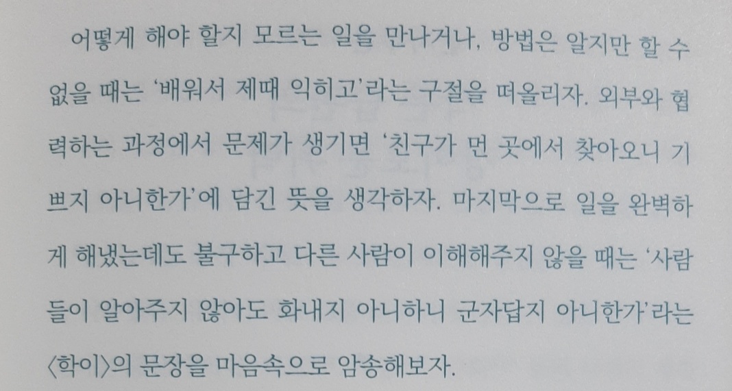 ‘나의 고통은 고작 집세와 업무에 한정되어 있었다. 하지만 공자가 살았던 춘추전국시대에는 생사가 걸린 일들이 많았다. 공자는 명성이 없는 상황이나 굶주림의 고통을 걱정하지 않았다. 공자의 이러한 가르침을 담은 『논어』에 대한 깨달음이 황홀하게 느껴졌다.’