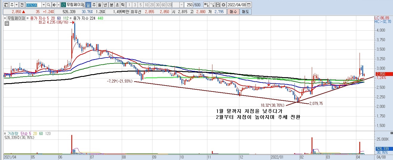 작년 6월에 최고점 4,235원을 찍은 후 7개월 이상 하락했습니다. 저점이 계속 낮아지다가 올해 2월부터 저점이 높아지는 추세전환이 보입니다.