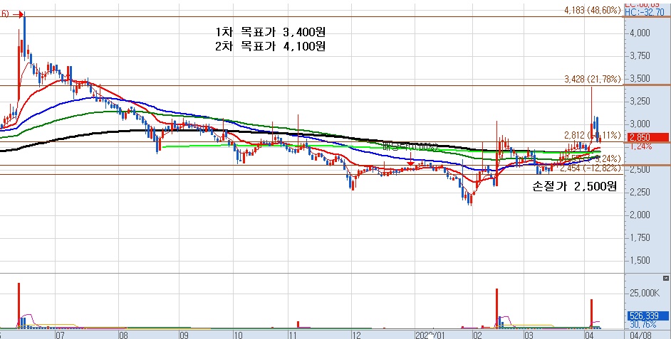 무림페이퍼 목표가는 1차로 3,400원, 2차로 4,100원 잡아봅니다. 손절가는 2,500원입니다.