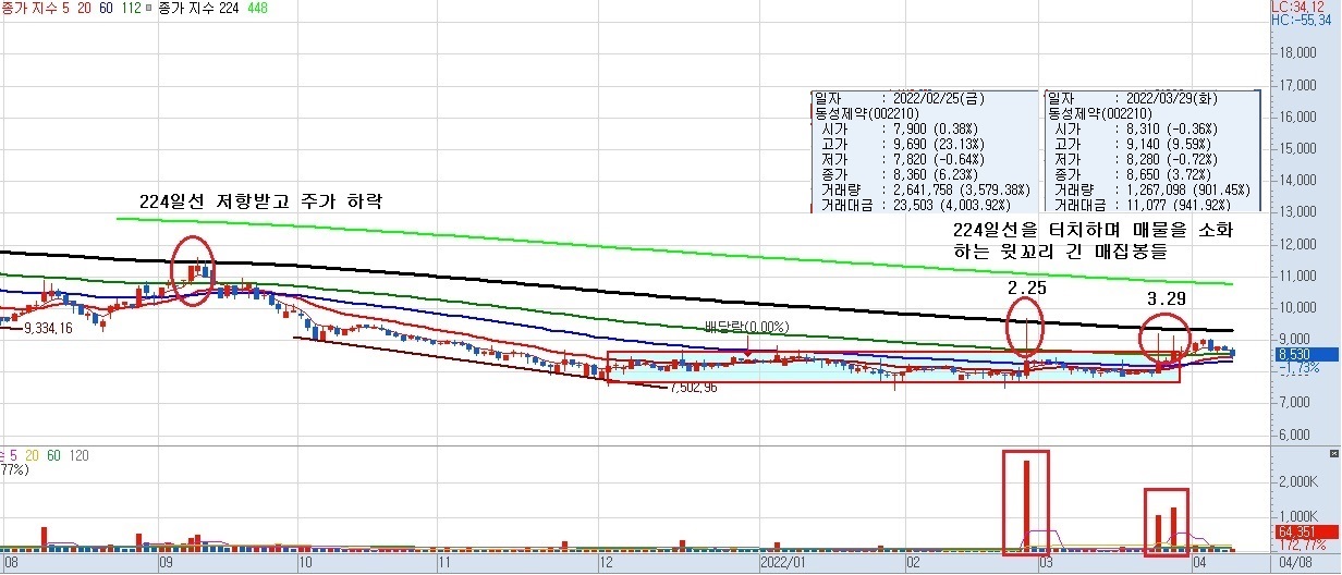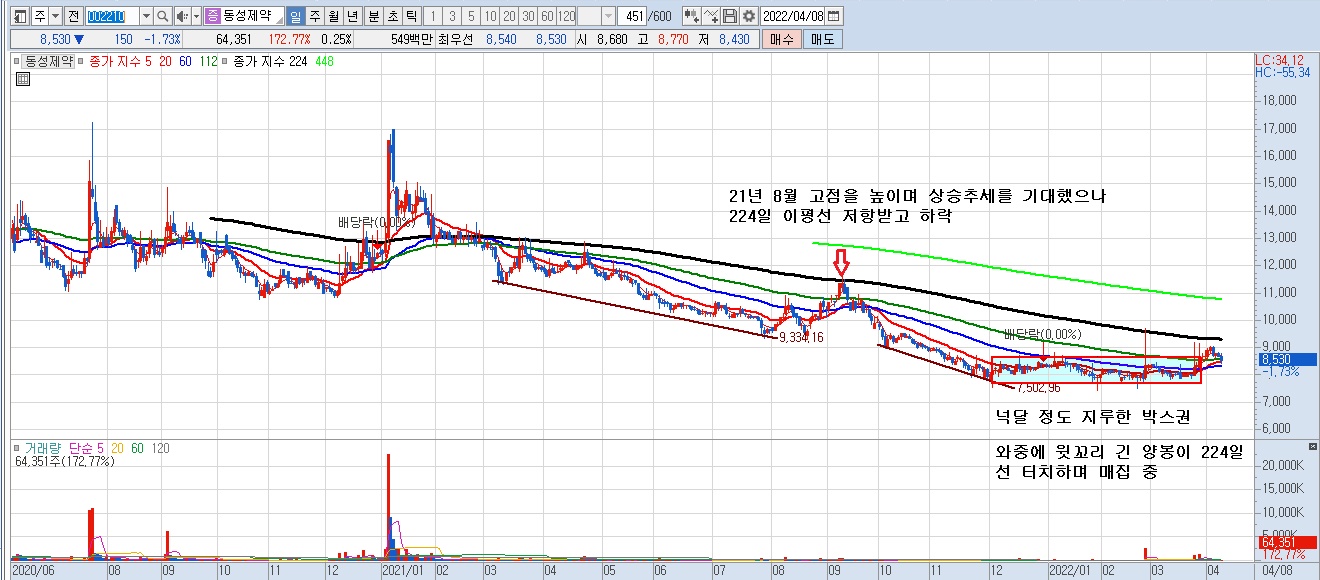 동성제약 일봉 차트를 보면 주가가 2021년 2월부터 1년 넘게 224일(1년) 이평선 밑에서 움직이고 있는 것이 보입니다.